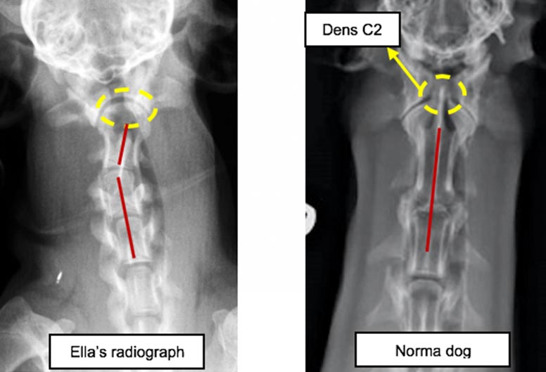 Patricia arranged for cervical radiography to help make a diagnosis and discovered that Ella’s cervical vertebrae had not developed so the alignment of her spine wasn’t correct. As she gently moved her neck the C1-C2 joint were trapping her spinal cord, causing her to collapse. She had a malformed C2 vertebra (missing odontoid process) and also had a curvature of the spine at C2-C3 possibly resulting from missing or weakened ligaments. She had been born with a wonky spine that was damaging her spinal cord as she was moving around.